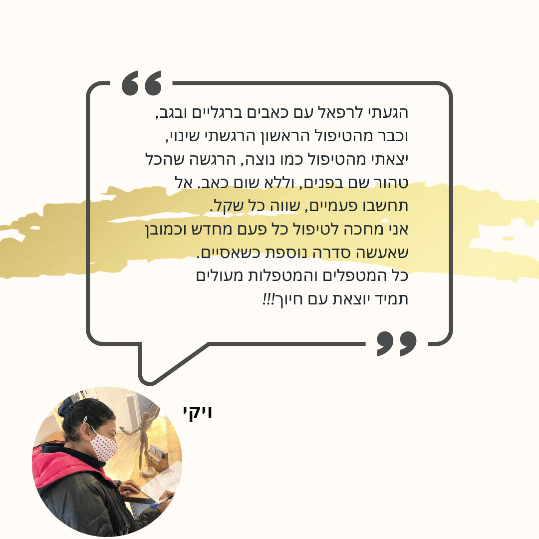 בהתחלה היו לי ספקות בטיפול ובמידת הצלחתי והתאמתו אליי במיוחד שהרופא האורטופד ייעץ לי לעבור ניתוח בגב, לאחר שהגעתי למרכז התחיל שיפור משמעותי אצלי, בהרגשת שיפור כללי במיוחד בפעילות היומיומית ובהליכה ובעמידה.